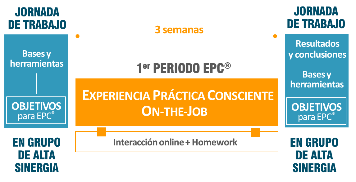 Periodos de Experiencia Práctica Consciente (EPC®). Entre sesiones, cada participante dispone de aproximadamente 3 semanas para vivir conscientemente lo trabajado on-the-job, en su entorno real, en su vida real. Es aquí donde ocurre el cambio y comienza el impacto organizacional, en la aplicación consciente en lo cotidiano.